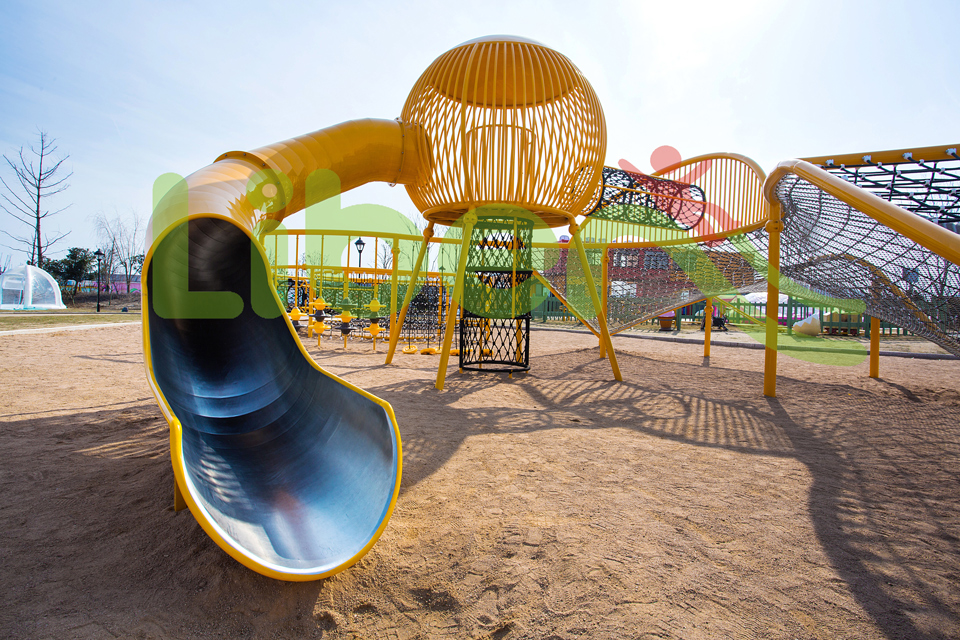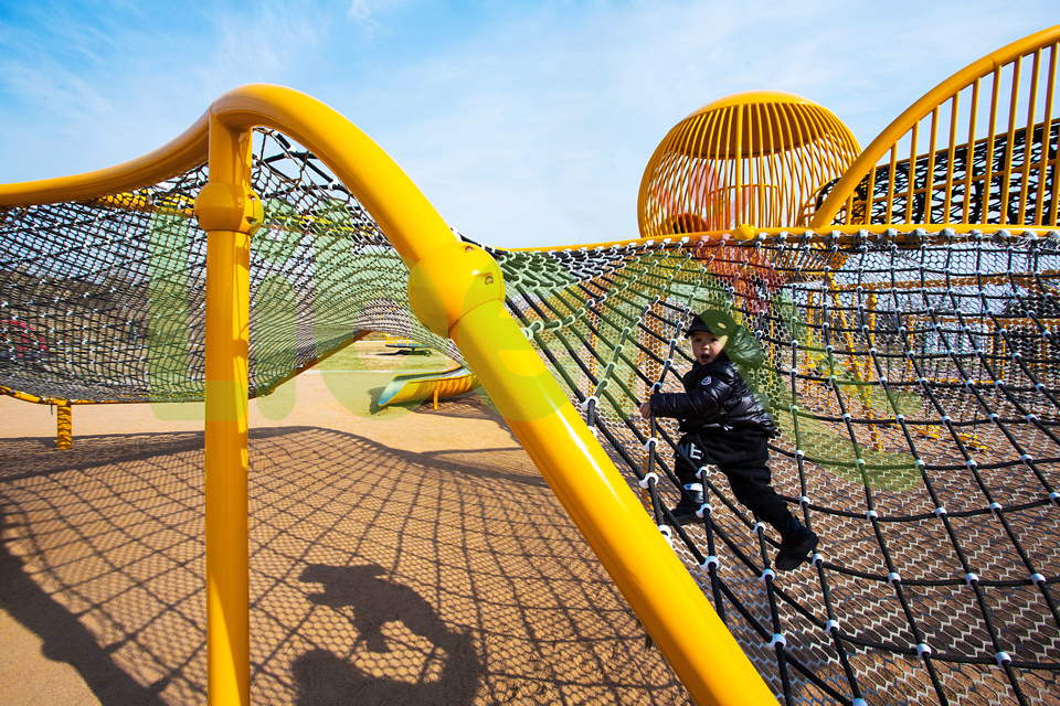 場(chǎng)地項(xiàng)目整體以明黃色為主色調(diào),以大型滑梯和爬網(wǎng)相結(jié)合,視覺上非常抓人眼球,讓人感受到滿滿活力,可以很好地調(diào)動(dòng)小朋友們的積極性。