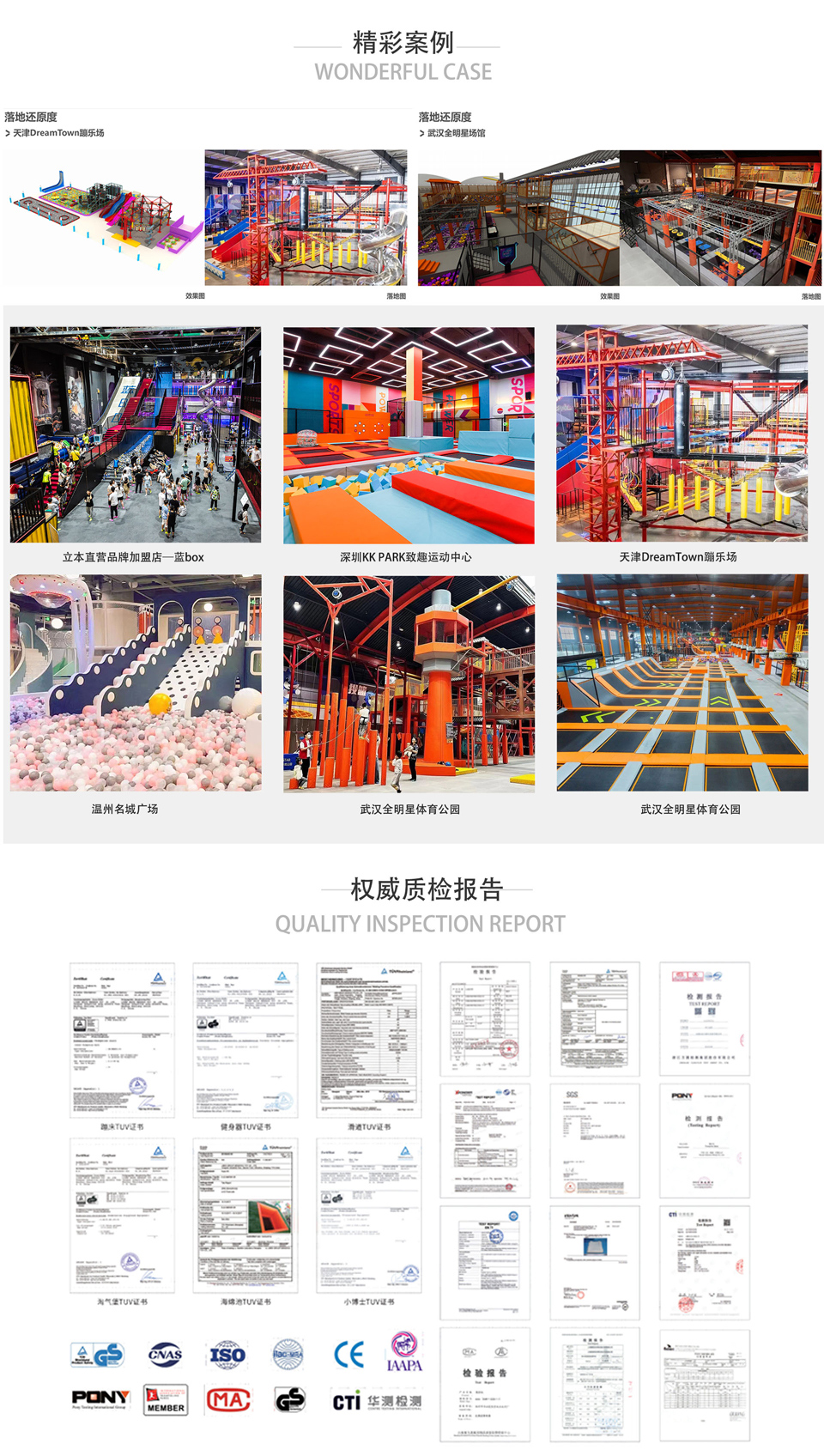 在蹦床公園中對任意的設(shè)備都需要有較強(qiáng)的保護(hù)意識,避免各種腐蝕物對設(shè)備的傷害,飲料、水、化學(xué)有害物質(zhì)出現(xiàn)在場館內(nèi)部。并且,對于彩虹繩網(wǎng)這樣易燃的設(shè)備,需要禁止煙火侵入。